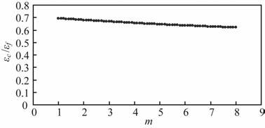 其比值也仅与m值有关.图 2 给出了εc/εf 与m的关系,发现其应变比值对m值不敏感,在1≤m≤8范围内,其变化范围为0.6931~0.6197,可近似为常数.