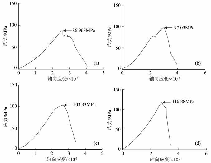 图 3 不同加载速率下石灰岩的应力应变曲线[13]加载速率为:(a)0.0005mm·s-1;(b)0.001mm·s-1;(c)0.002mm·s-1;(d)0.005mm·s-1. Fig. 3 The stress-strain curves with different loading rates for limestone |
