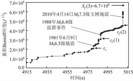 图 4 青海玉树地震区1738~2010.6.7之间累积Benioff应变与时间关系[16]为使图件清晰,1915年以前的应变值作为初值.横坐标对应的时间减去3000年为实际年份 Fig. 4 Temporal distribution of cumulative Benioffstrain in the period from 1738 to 7 June 2010 for theYushu seismic zone in QinghaiThe strain value prior to 1915 is regarded as an initial one forseeing a more clear figure .The real tme s the value on thehorizontal axis mnus 3000 years |