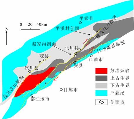 图 1 剖面位置及龙门山断裂地质简图 Fig. 1 Outcrop location and regional geological mapof Longmenshan fault |