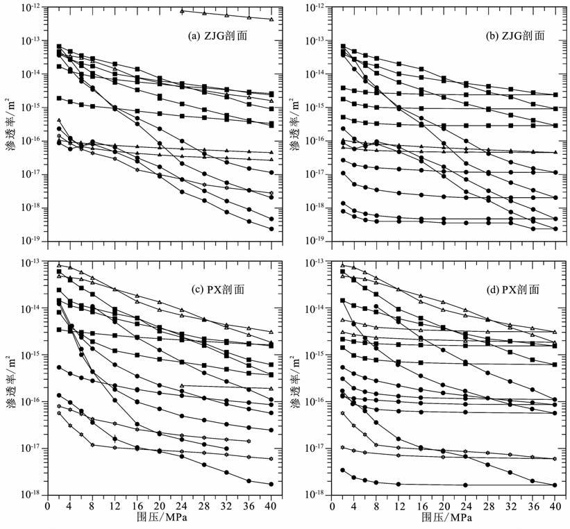 表 1给出了4MPa和40MPa围压下的渗透率测量结果.图 7为渗透率随围压的变化情况,部分样品还给出了一个加载-卸载周期内的渗透率变化.由于实验的工作压力较低(<0.6 MPa),围压可近似为有效压力.研究表明渗透率κ 随有效压力Pe的变化符合指数关系,κ=κ0exp(-γΔPe)[10, 32],其中γ(MPa-1)为压力敏感系数,其值正比于图 7 中曲线的斜率(存在-ln10倍的关系).分别对2~12MPa和24~40 MPa有效压力段的数据进行了拟合,结果如表 1.