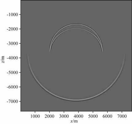对于更极端的问题,我们进行了高对比度速度分层均匀介质模型的模拟试验,介质分界面位于地下3615m 处,介质上层的速度是1500m/s, 下层的速度是3000m/s.震源位于地下(3840 m, 3465 m)处,由主频为30Hz的Ricker子波激发产生.时间间隔为2.5ms, 空间间隔为15m, 模型沿横向和纵向各剖分512个网格点.检波器位于(3840m, 3090m)处.