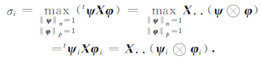 其中σi为第i主成分的特征值,ψi和φi分别为n维和p维向量,代表第i主成分和第i主轴.运算符“.."表示的是张量的缩进运算,此处等价于张量空间的内积运算,“⊗ "为张量积或Kronecker积,ψi⊗φi的结果为n×p的二维张量.s×v×t的三维张量Y的分解形式为: