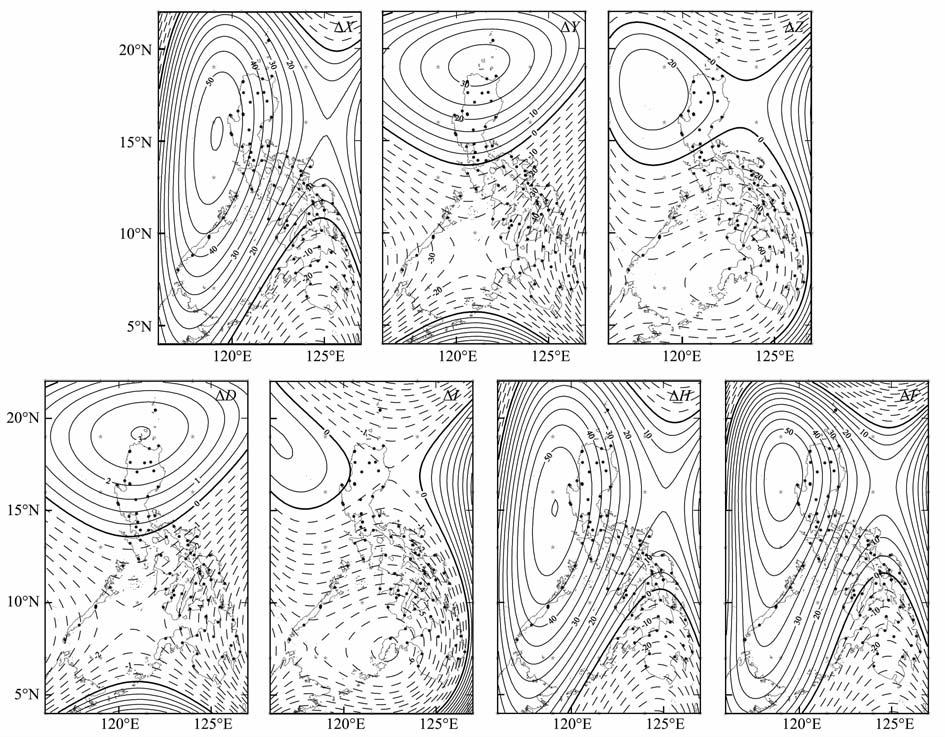 图 3可以看出,X、H的分布相似,在10°N 左右出现系统的拐点,使X、H的分布由高纬地区的北西-南东走向转为低纬地区的近似北东-南北走向,这种分布使得同纬度地区的X、H东高西低,最大值均分布在9°N,116°E 左右的地区.D、Y空间分布特征相似,零线分布于8°N 左右呈东西展布,其北侧为负,南侧为正,且等值线沿经度分布的同时,在纬度上有不同程度的小起伏.D值的分布大约在0.5°至-2.5°,Y值的分布大约在500nT至-1700nT.Z、I空间分布呈现比较规则均匀的东西向分布,等值线比D、Y两个分量的等值线更规则、光滑.零线分布在7.5°N 左右,零线北部是正值区域,南部是负值区域,Z、I正的最大值分布在菲律宾的最北端,分别为20000nT 和28°,负的最大值分布在菲律宾的最南端,分别为-600nT 和-5.5°.在10°N 以北地区,总强度F的等值线呈现北东-南西向分布,在8°N左右总强度的等值线出现系统拐点,在10°N 以南地区,总强度的等值线呈现北西-南东向分布,总强度最大值分布在8°N,126°E左右,值约为40800nT.
