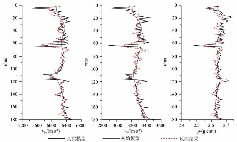 图 2是利用式(2)进行线性近似反演的结果,纵波速度反演结果最好,也最稳定,密度次之,横波速度的结果最差.图 3是直接使用式(1)进行非线性反演的结果,虽然横波速度反演精度相对于线性反演有提高,仍然存在较大的误差.