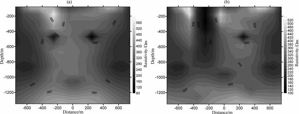 图 9 埋深d=100m, 倾斜45°,ρ异常=2000Ωm (a)和ρ异常=50Ωm(b)视电阻率拟断面图 Fig. 9 d=100m, tiltangle45°,ρa=2000Ωm (a)andρa=50Ωm (b)resistivity drafting cross section |