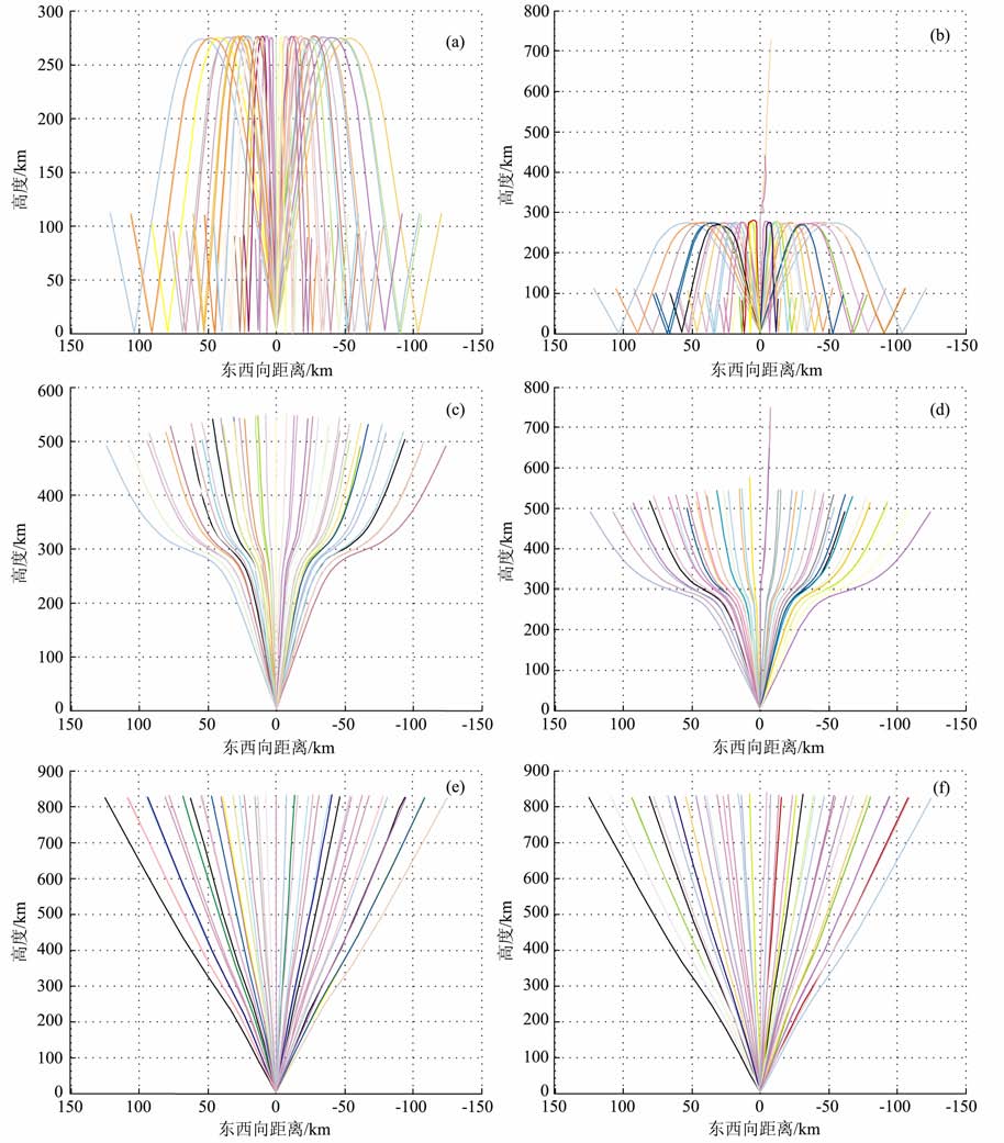 图 12 释放SF6-100mol-300km-60s (a)(c)(e)分别为无空洞情况下频率为13.2、13.5、20 MHz的高频电波传播射线图;(b)(d)(f)分别为有空洞情况下频率为13.2、13.5、20 MHz的高频电波传播射线图. Fig. 12 Release SF6-100mol-300km-60s (a)(c)(e)are the high-frequency wave propagation ray figure of the frequency at 13.2,15,20 MHz having none hole;(b)(d)(f)are the high-frequency wave propagation ray figure of the frequency at 13.2,15,20 MHz having hole. |