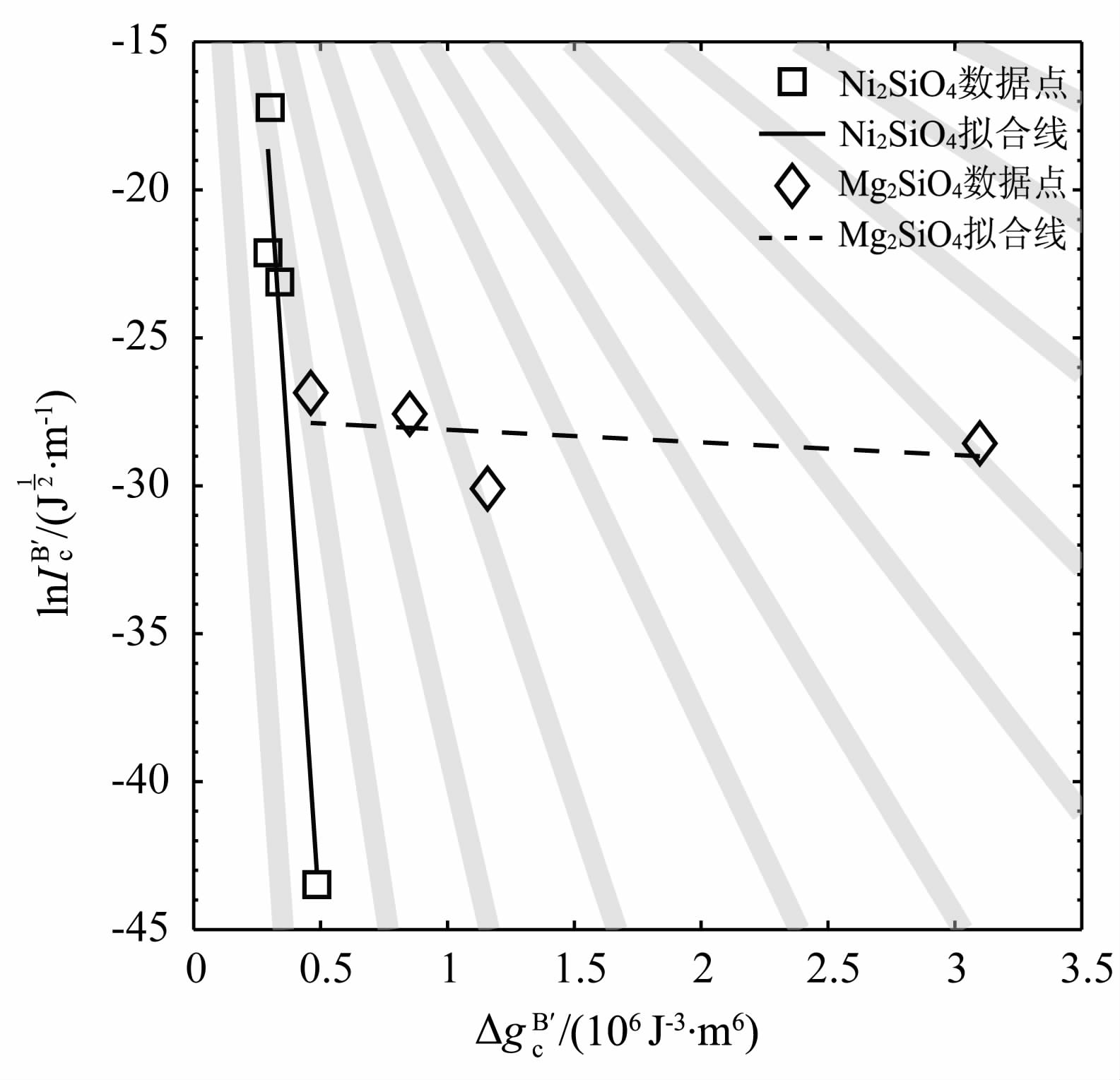 图中横坐标为 ,其中,ΔgcB是边界成核情形的临界Gibbs自由能,k是玻耳兹曼常数,T是温度,Φ 是形状因子,表征同样底面积的球冠和半球的体积比,σαβ 是反应相颗粒和生成相颗粒接触的表面能,Vβ 是生成相物质的摩尔体积,ΔGd 是摩尔驱动能.纵坐标是lnIcB′ =lnIcB - ,其中IcB 是按照传统的Cahn的相变体积分数对实验数据拟合得到的成核率[9], ΔGa 是摩尔活化能,d是颗粒大小,h是普朗克常数,r0 是橄榄石分子大小.图中方块和菱形分别是Ni2SiO4 和Mg2SiO4 的成核率所对应的数据点.实线和虚线分别是Ni2SiO4 和Mg2SiO4 的成核率数据点所对应的拟合直线.阴影线是符合接触角度在(0,π/2)之间的参考线,只有比相同截距的参考线斜率更小的拟合直线才是符合条件的.
