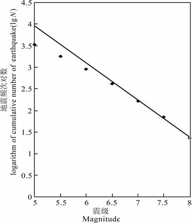 对所收集的地震资料进行完备性分析,见图 1, 图 1横坐标为震级,纵坐标为累计地震数的对数.图中统计了1700~2009年的资料完备性,从图中可以看出,1700~2009 年最小完备震级为6.5 级,考虑到资料的可靠性,选取M≥7级为本文的研究资料.