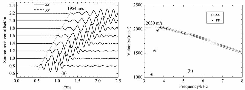 当横向各向同性介质对称主轴与井轴(z轴正向)在oxz平面内成一定角度α 时,接收器水平平面内快、慢横波的极化方向是正交的.以下计算中声源主频为5kHz, 接收器间隔为0.2 m.图 3a~ 图 6a分别为α 等于0°,45°,60°,90°时在硬地层(参数见表 1)中模拟计算的交叉偶极测井xx,yy两分量多道波列.不同接收距波形按第一接收器最大值归一化.图中标出了xx,yy两分量弯曲波第一波至的等相位线,并由各接收器时差计算出了传播速度.由于弯曲波是强频散的导波,由同相轴时差得到的是群速度,并不对应于该方向的地层的横波速度.图 3b~图 6b给出了用频域加权相似法[15]提取的xx,yy两分量弯曲波的频散曲线.