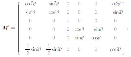 将介质对称轴绕y轴旋转-α,则介质弹性常数矩阵变为C1 =MC0MT,M为变换矩阵,MT 为M的转置矩阵.M的具体形式如下: