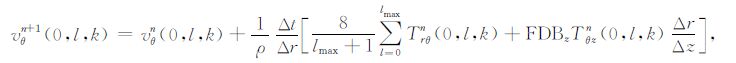 其中rj=jΔr,θl=lΔθ,zk=kΔz,tn=nΔt,Δr,Δθ,Δz分别为网格在三个方向上的空间步长,Δt为时间步长.本文采用时空交错网格上二阶精度的中心差分[14].为了能既节省机时又保证差分稳定性,根据柱坐标中FD 算法稳定性准则的经验公式,取
