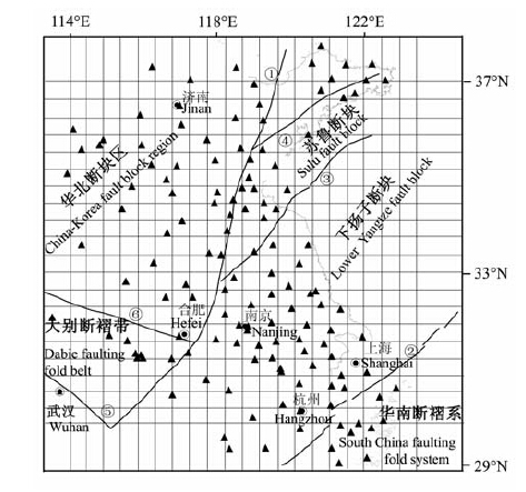 图 1 江苏及邻区构造、地震台网分布和模型网格示意图 ① 郯城-庐江断裂,② 江山-绍兴断裂,③ 淮阴-响水断裂,④ 烟台-五莲断裂,⑤ 广济-襄樊断裂,⑥ 肥中断裂,▲地震台站. Fig. 1 Over view of tectonics and distribution of seismicnet work in Jiangsu and neighbor in gareas ① Tancheng-Rujian fault , ② Jiangshan-shaoxing fault , ③Huaiyin-Xiangshui fault , ④ Yantai-wulian fault , ⑤ Guangji-Xiangfan fault , ⑥ Feizhong fault , ▲ Seismic station . |