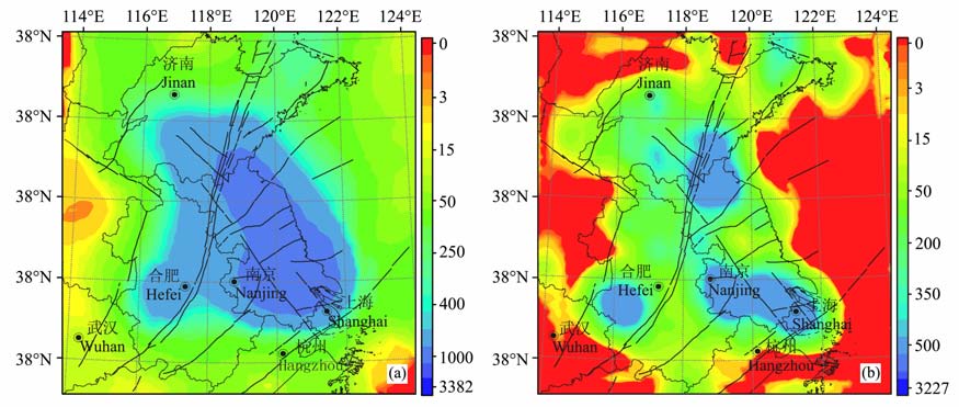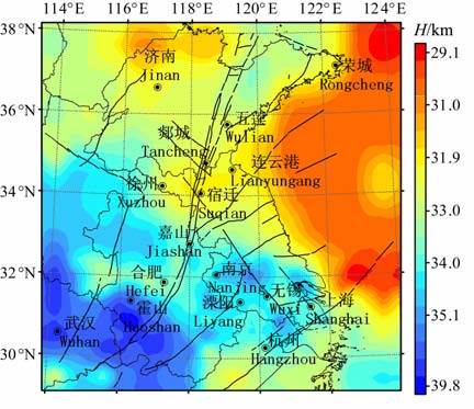4.2 郯庐带鲁苏皖段及邻区地壳厚度空间变化特征图 5为反演获得的郯庐带鲁苏皖段及邻区莫霍面深度图.该区莫霍面深度总体呈现西深东浅、南深北浅的特征.莫霍面深度与构造分区大体吻合.其中,黄海海域莫霍面深度在30km左右.长江口以东海域存在一个莫霍面深度为29.1km 的区域.苏鲁断块莫霍面平均深度为32.7km, 五莲-荣成断裂与嘉山-响水断裂和郯庐带之间超高压变质岩带莫霍面深度为32km.华北断块北部的山东地区莫霍面深度约31-33km, 中部的安徽、河南一带莫霍面深度约为33-35km.下扬子断块莫霍面深度平均为34.14km.苏南地区莫霍面较苏北地区的莫霍面深,其中,苏南地区莫霍面深度为35km 左右,苏北地区为33km 左右.在苏南的太仓至上海崇明、苏州、镇江一带存在莫霍面下凹现象(深度达36.6km).大别断褶带莫霍面最深,合肥以南的大别山地区莫霍面深度为35-35.8km.
