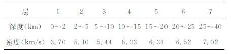 3.2 地震成像中初始模型的选取根据地震射线密集程度选择网格大小,本研究设计网格个数为22×22×7,其中研究区中部大多射线密集的区域,网格为40km×40km, 可以保证研究区中部网格内至少有20条以上射线通过,对研究区域的边缘部位(地震射线密度较少的地区),网格单元加宽.本文另参考了上海奉贤至内蒙古阿拉善左旗地学断面的HQ-13 测线[14]、江苏响水至内蒙古满都拉地学断面的连云港至泗水测线[15]、大别造山带的人工地震测线[7-13]结果.基于以上研究成果,建立初始模型,将地壳分成7 层,表 1 给出了这7层介质的P 波速度.初始模型另含Moho界面、与Moho界面对应的滑行速度信息.要求Moho 界面及其变化位于第7 层内(25-40km),因此第7 层的地层为25km 至Moho之间.在速度模型中,假设每一模块内速度均匀.Pm、Sm, Pn、Sn 震相分别是Moho界面的反射和折射波震相.对有人工地震测线通过的网格,用地震测深结果对模型参数进行约束,在反演迭代过程中,被约束的模型参数不变,从而加快收敛.