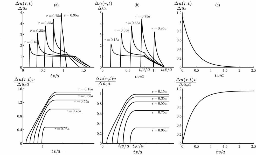 图 1 (a)M-模型每一个圆环所对应的平均滑动速率和滑动位移函数.v 是初始破裂速度,a是最终破裂半径,vR 是破裂速度,t是时间,Δ$\dot{u}$0是初始滑移速率,$\Delta \dot u$ 是滑移速率.取vR/β=0.9,在时间ts(r)之前图形是自相似的,ts(r)表示P 波停止相位的到时函数.曲线的拐点就是其到时,预示着断层开始愈合;(b)D-模型每一个圆环所对应的平均滑动速率和滑动位移函数,在时间ts =0.82a/v 之前图形是自相似的,之后断层开始减速,直到th =1.22a/v 时整个断层滑动愈合.但是,在r=0.95a时破裂前缘存在延迟;(c)由Brune[4]模型给出的平均滑动位移速率和滑动位移函数 Fig. 1 (a)Plots of the relative slip velocity and slip, for the M-model.v isinitialrupturevelocity,aisfinal fault radius,vR is rupture velocity,tistime, $\Delta \dot u$0 is in itial particle velocity, $\Delta \dot u$ isparticle velocity.vR/β=0.9,at five different radii. The motionat each radiusis self-similar untilts(r),which is the arrival time of the P-wave stopping phase. The corners in the slip velocity mark this arrival time; (b)Plots of the relative slip velocity and slip, for the D-model at five different radii. The motion at each radiusis self-similar untilts =0.82a/v ,whenthe fault begins to decelerate. The slipheals over the entire fault surfac eatth =1.22a/v .Note the delay of the rupture front arrival forr=0.95a; (c)Plots of the relative slip velocity and slip, for the Brune-model[4] |