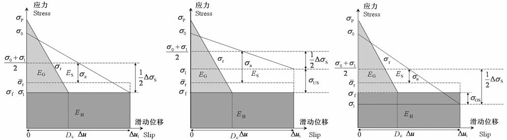 图 2 三种应力状态下的能量分配图(a)完全应力降模式;(b)应力下调模式;(c)应力上调模式.其中,σP 为屈服应力,σ0 和σ1 分别为初始应力和终止应力,σf为最终滑动摩擦应力,σr为破裂过程中滑动摩擦应力,σr为平均滑动摩擦应力,σUS 为应力下调模式下最终应力与滑动摩擦应力之差,σOS 为应力上调模式下滑动摩擦应力与最终应力之差. Fig. 2 Energy partitions based on three kinds of stress model(a) Total stress drop; (b)Undershoot; (c)Over shoot model.In which,σP is the yields tress which in dicates the streng thof fault ,σ0 andσ1 are the in it ialand final shear stress esapplied on the fault , respectively.σf andrf are the final dynamic frictional and resisting stresses, respectively.σr is the average frictional stress,σUS is the difference betweenσ1 andσf for under shoot.σOS is the difference betweenσf andσ1 for over shoot. |