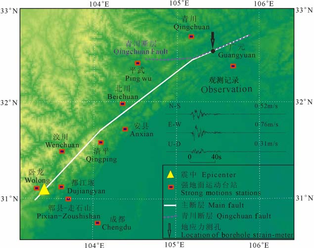 图 4 汶川地震地应力测孔位置以及绵竹清平台站三分量速度记录 Fig. 4 Location of borehole strain and the velocity observation in Mianzhu Qingping in Wenchuan Earthquake |