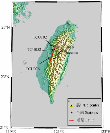 图 5 三个近断层台站的位置 红线代表断层,三角形代表震中位置. Fig. 5 The three near fault station The red line and triangle are the fault and the epicenter, respectively. |
