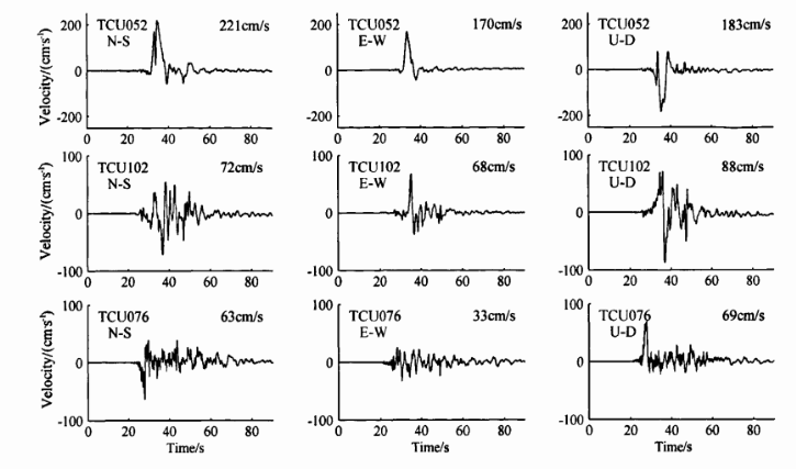 由于绵竹清平台站位于近断层5km 处,所以利用兰景岩等[17]给出的绵竹清平强震记录质点速度(如图 4)和王卫民等[16]反演得到的平均位错量2.23m, 可以由