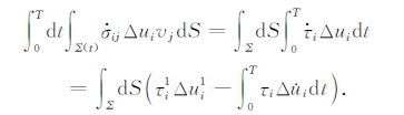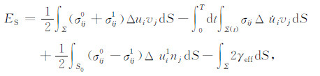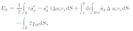 其中,σij0和σij1分别为初始应力和终止应力,σij为瞬态应力,$\Delta {\dot u_i}$是滑动速率,Δui为滑动位移,Δui1是最终滑动位移,Σ 为断层面面积,T为滑动过程所经历的时间,S0 是包含断层面的一个封闭曲面,vj和nj为作用于断层面Σ 和S0 的单位方向矢量,γeff 为有效表面能.如果S0 远离震源区,即封闭曲面的半径远大于断层的特征尺度,r$\gg $L,则公式(2)中右侧第三项可以忽略.分部积分后则有: