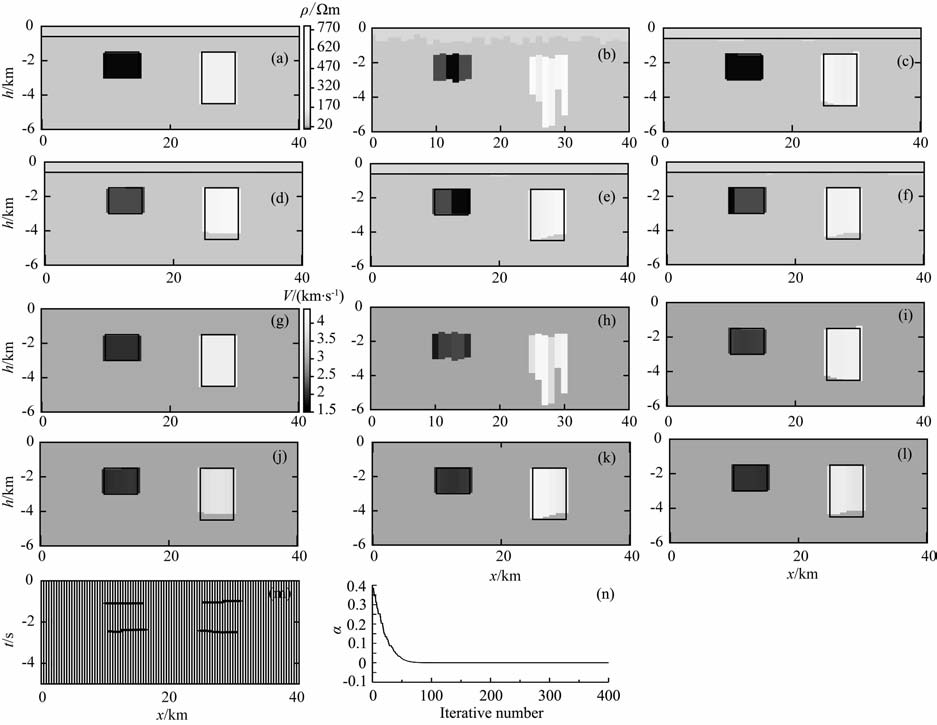 4 模型试验 4.1 模型试验1如图 1(a, g)所示,本文考虑了速度和电阻率界面不完全一致的情况,模型浅层存在厚度为0.6km, 电阻率为100Ωm 高阻层,而速度无变化.背景电阻率为50Ωm, 背景速度为3km/s.此外还设计了两个块体:一个为低阻低速体,电阻率为5Ωm, 速度为2km/s, 顶底埋深分别为-1.5km 和-3km, 块体横向从10km 延伸至15km; 另一个为高阻高速体,电阻率为500Ωm, 速度为4km/s, 顶底埋深分别为-1.5km 和-4.5km, 块体横向从25km 延伸至30km.