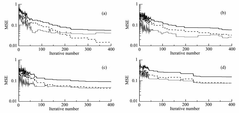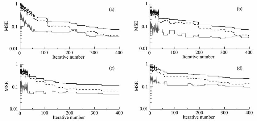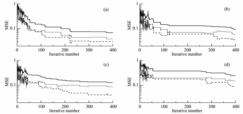 图 2 WMT:WS=2:1时各方案目标函数均方根误差曲线 (a)方案一;(b)方案二;(c)方案三;(d)方案四. Fig. 2 Root mean square error of parameter functional in different projects whenWMT:WS=2:1 (a)Project1;(b)Project2;(c)Project3;(d)Project4. |