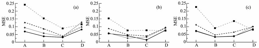 为了更加清晰地了解这四种方案的反演精度,以及模型参数逼近程度,本文统计了迭代反演完成后,四种方案在三种权重选择下的目标函数的均方根误差(总均方根误差、MT 均方根误差、地震均方根误差),以及模型参数的反演结果与真实模型之间的总均方根误差,具体见图 5.图 5 中的纵坐标A、B、C、D 分别为目标函数的总均方根误差、MT 均方根误差、地震均方根误差以及模型参数的反演结果与真实模型之间的总均方根误差.圆圈、十字、三角和矩形符号分别代表方案一、二、三、四,分别用黑色实线、灰色实线、黑色虚线、灰色虚线连接.