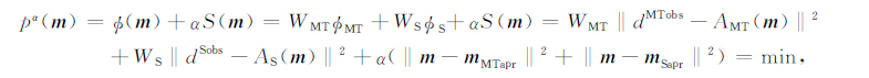 式(1)中Pα(m)为参数泛函,Φ(m)为数据拟合泛函,S(m)为模型稳定泛函(也称为稳定器),本文采用最小模型约束,α 为正则化因子,ΦMT、ΦS 分别为MT视电阻率或相位、地震走时的计算值与观测值的数据均方根误差,WMT、WS 分别为MT 和地震数据相应的加权系数,AMT为MT 的正演算子,AS 为地震的正演算子,dMTobs和dSobs分别代表MT 和地震数据的观测值,mMTapr和mSapr分别代表MT 和地震的先验信息.