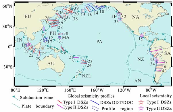 图 1 本文39个双地震带剖面,蓝色框(细线)为剖面区域,中间线(粗线)为剖面位置,其中红色的为I型,粉红色为II 型,蓝色为DDT/DDC,新西兰(标记为‘NZL'未包含在本文分析之中.数字为对应剖面的序号,见表1.板块简称及对应 板块分别为:AN,南极洲板块;AU,澳大利亚板块;EU,欧亚板块;JF,胡安德富卡板块;IN,印度板块;NA,北美板块;NZ,纳斯卡板块;PH,菲律宾海板块;SA,南美板块 Fig. 1 Regional profiles of 39 double seismic zones, each rectangle (thin in blue) denotes region of one profile,the middle thick lines are the profiles for DSZs,of which Type I DSZs are in red,Type II DSZs are in magenta,and those with DDT/ DDC are in blue, while New Zealand (NZL) is excluded. Plate abbreviations are AN, Antarctic ; AU, Australia ; EU, Eurasia; JF,Juan de Fuca; IN,India; NA,North America; NZ,Nazca; PH, Philippine Sea plate; SA, South America |