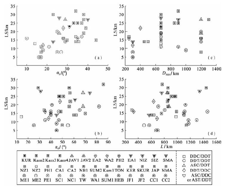 图 3 双地震带特征与俯冲形态特征的关系 (a)浅俯冲角;(b)深俯冲角;(c)最大俯冲深度;(d)俯冲板片长度.底部框为图例,包括各双地震带符号及对应名称、应力状态,其中DDC 为 Down-Dip Compression; DDT 为 Down-Dip Tension; ASC 为 Along Strike Compression; AST 为 Along Strike Tension;DDC/DDT 形式表示上、下层各自的应力状态(见表 1).图 4至图 7的图例与本图相同. Fig. 3 Relationships between DSZs´ features and subduction geometry. (a) Shallow dip angle; (b) Deep dip angle; (c) Maximum depth; (d) Length. Legend shows the symbol of DSZs and corresponding name and stress state; DDC-Down-Dip Compression; DDT-Down-Dip Tension; ASC-Along Strike Compression; and AST-Along Strike Tension (Table 1 for details). The legendsofFig. 4~7are as same asFig. 3 |