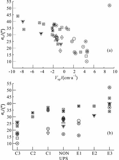 图 4 浅俯冲角与(a)上覆板块速度、(b)弧后形变特征的关系 Fig. 4 Relationship between DSZs´ features and (a) overriding plate velocity and (b) deformation pattern of back-arc basin |