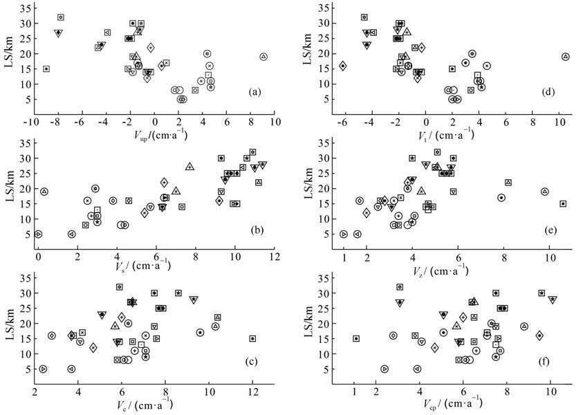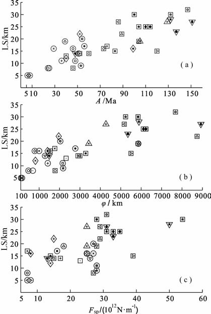 不论俯冲速度还是板片长度的影响都比年龄小(对应相关系数小,分别为R=0.40,R=0.17);而年龄为独立变量,且不依赖于其他任何因素.因此,热参数及板片拉力对层间距的影响可能直接反映了板块年龄的影响.整体上层间距与年龄关系的线性表达式为LS=6.46+0.151A,表明板块年龄越大,层间距越大(图 5a),不过这种线性关系似乎不能描述海洋岩石层最初俯冲时(或年龄小于10 Ma时)所形成的双地震带层间距[40~45](该部分将另文讨论).