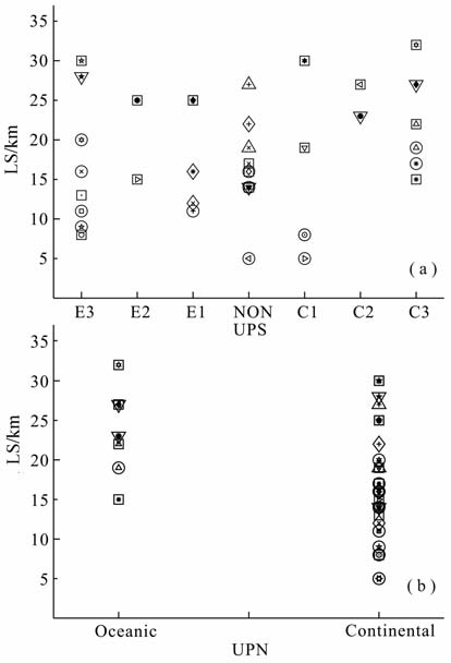 3.4 上覆板块性质双地震带所在俯冲带的上覆板块为大陆型的共32个(表 1,图 7b),海洋型的共有7个(NB1、HEB、TON、KER、SIZ、NMA、SMA).海洋型处的双地震带层间距都大于15km.而Brudzinski等(2007)[19]提供的32组数据中,大陆型除(JAP、NIZ、JAV2、WA2)层间距大于20km 之外,其余层间距均小于20km.上覆板块的性质似乎决定了双地震带层间距的上下限,其中大陆型上覆板块所对应的DSZ 层间距小于20km;而其余8个海洋型对应DSZ 层间距则大于15km.如果此推论成立,洋-陆俯冲带内形成的双地震带的层间距可能需要修正,这当然也包括根据不同区域台站确定的双地震带,如CC2、KUR、Kam2、Kam3、Kam4[12~16].