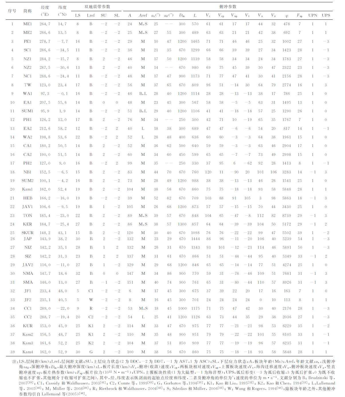 2.3 其他俯冲参数这39个俯冲带所覆盖的区域与文献[46]给出的73个剖面重叠,而这些相邻剖面的俯冲参数相差不大,本文将直接从这些剖面中挑选出与双地震带剖面重合的部分作为俯冲带参数数据,包括板片形态、俯冲速度、海沟迁移速度、弧后形变模式等,加上板块年龄共15个俯冲参数(表 1).
