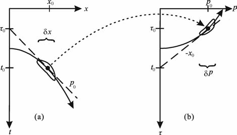图 2 局部倾斜叠加方法示意图(Burnet[17]).局部倾斜 叠加将CMP道集中的双曲时距关系(a)映射到了 τ-p 域的椭圆时距关系(b) Fig. 2 A sketch of local slant-stacking approacl (Burnet[17]). The hyperbolic event in a CMP gather (a^ is mapped into an elliptic event (b) in theτ-p domain |