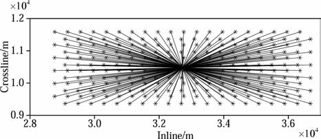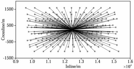 图 5 某窄方位角观测的CMP面元的炮检坐标分布 Fig. 5 Shot-receiver coordinates of a CMP gather from a narrow-azimuth geometry |