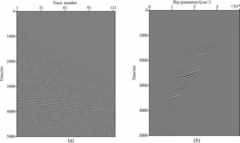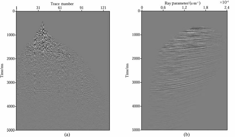 图 8 CMP道集(a)及对应的平面波数据(b) Fig. 8 CMP gather (a) and the corresponding offset plane-wave dataset (b) |