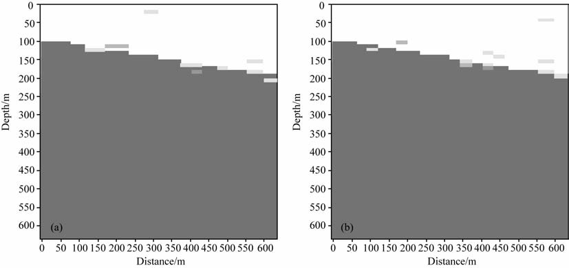 图 11 模型2的反演结果 (a)初始模型为2500 m • s-1的均匀模型;(b)初始模型为3000 m • s-1的均匀模型. Fig. 11 Inversion results of model 2 (a) Initial homogenous model, the velocity is 2500 m • s-1 ; (b) Initial homogenous model, the velocity is 3000 m • s-1 |