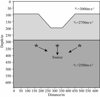 设计如图 12所示的三层非均匀模型3,模型含一U 型凹陷粗糙分界面.三层速度分别为3000m·s-1,2700m·s-1和2500m·s-1.初始模型为2500m·s-1的均匀模型.其他参数如前所述.