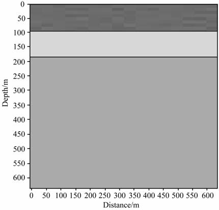 为了进一步研究该算法的抗噪能力,我们对模型1生成的地震记录添加了10%的随机噪声,然后进行反演.图 9为反演后的结果.可以看出,速度分界层清晰可见,除第一层反演得到的速度有一定的波动外,第二层介质和第三层介质得到的结果与真实值十分接近.这是由于反演过程中受到了添加噪声的影响,而下面两层介质由于真实速度分别是反演过程的速度取值范围的极大值和极小值,因此噪声对其影响并不明显.分析第一层速度数据可以得出,噪声造成的最大速度扰动也仅为背景速度的1%左右,这说明该算法具有良好的抗噪能力.