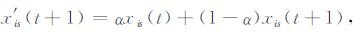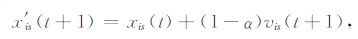 式(3)中,xis(t+1)为粒子的当前位置,xis(t)为粒子的前一次位置,xis′(t+1)为粒子的新位置.α介于[0, 1]之间,代表粒子的前一次位置和当前位置在粒子新位置选择中所占的权重.