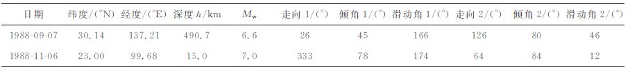 地震仪器有三分向(NS、EW、UD)记录,也有单分向(UD)记录,仪器极性倒转会导致P 波初动反向.因此,利用P 波初动反演震源机制解需要核对仪器极性是否正确.通常可以由全球的远震和深震来检验,当震源机制基本确定后,地震记录三分量初至P波初动方向存在确定的关系.而远震和深震记录的P 波初动比较清晰,易于准确辨认,为我们检验台站地震仪记录状况提供了可靠的信息.大同地震遥测台网从1988年9月开始运行,至1989年10月大同震群发生之前可以找到2次地震作为校核的对象.表 1中两次地震参数取自哥伦比亚大学拉蒙特- 多赫蒂地球观象台GlobalCentroid MomentTensor database (http://www.globalcmt.org/CMTsearch.html[2011-02-23]).针对表 1中的两次地震,大同地震台网各个台站的方位角、离源角计算结果见表 2.