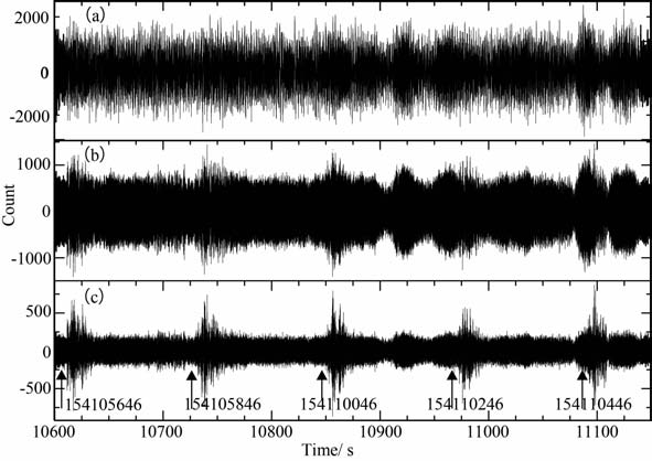 图 5 琛航台的原始记录及滤波结果 (a)原始记录;(b)4〜10 IIZ带通滤波;(c)4〜8 112带通滤波.箭头处为炮点时间. Fig. 5 HH original records and the filtered results (a)Original record; (b)4〜10 Hz band-pass fltered record; ( c)4〜8 Hz band-pass filtered record. The arrows label the shot times. |