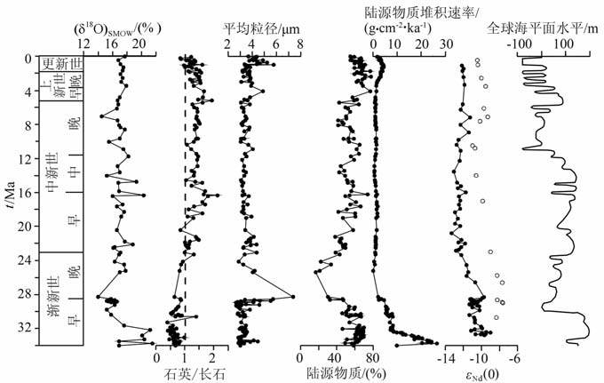 图 5 南海北部ODP1148站34Ma以来沉积物石英氧同位素值,陆源矿物石英/长石比值,陆源物质平均粒径,陆源物质百分含量[26],陆源物质堆积速率,Nd同位素εNd(0)值[13,20]及全球海平面变化[32]图 Fig. 5 Variations of oxygen isotope ratios of quartz, quartz/feldspar ratio, median grain size of terrigenous materials,weight percents of the total terrigenous materials in bulk samples[26] , mass accumulation rates of terrigenous materials, Nd values[13,20] and global sea level[32] |