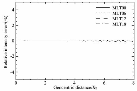 图 5给出了遗传2000代后的密度分布与原始密度分布的对比曲线.图 6给出了光强的相对误差曲线.可知除地球遮挡区域以外(MLT=0),其他矢径方向的反演结果都比较理想,反演得到的光强误差趋于0,而反演得到的密度只在8.0RE 附近出现微小扰动,最大相对误差为8%,在等离子层顶附近和等离子体层内,相对误差趋于0.对于地球遮挡区,由于夜侧等离子体层密度变化较小,因此可以利用插值方法最终得到夜侧等离子体层密度.