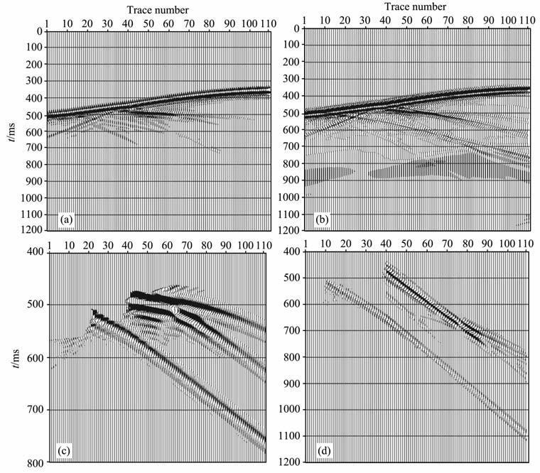 图 2 由倾斜层速度模型得到的非零偏VSP弹性波波场分量及波场分离后的上行波场 a水平分量;(b)垂直分量;()上行波水平分量;(d)上行波垂直分量. Fig. 2 The offset VSP elastic wavefield components of velocity model in Fig. 1 and corresponding upgoing wavefield components (a)X-component; (b) Z-component; () X-component of upgoing wavefield;d) Z-component of upgoing wavefield. |