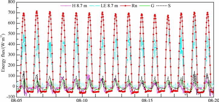 图 3 8月5日到8月19日8.7 m净辐射、感热通量、潜热通量、土壤热通量和土壤热储存日变化 Fig. 3 Diurnal variations of net radiation,sensible heat flux,latent heat flux,soil heat flux and soil heat storage at 8.7 m from August 5 to August 19 |