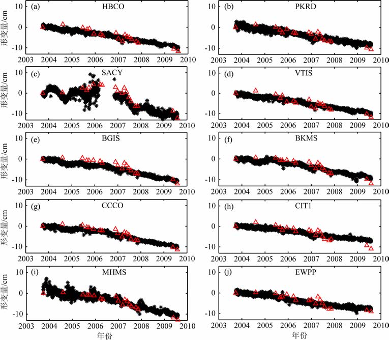 图 3 SBASD-InSAR(红色三角形)与GPS(黑色星号)投影在LOS方向上的形变结果比较.其中(a)~(j) 分别表示HBCO,PKRD,SACY,VTIS,BGIS,BKMS,CCCO,CIT1,MHMS和EWPP 等GPS站点 Fig. 3 Comparison between SBAS D)-InSAR (red triangles) and corresponding LOS-projected GPS (black stars) deformation time series (a)~(j)indicateGPS stations ofHBCO,PKRD,SACY,VTIS,BGIS,BKMS,CCCO,CIT1,MHMSand EWPP,respectively |
