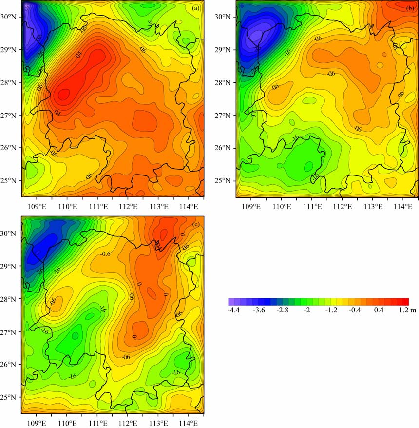 图 6 剩余均衡大地水准面(等值线间隔:0.2 m) (a)n=20; (b)n=70; (c)n=150. Fig. 6 Residual isostatic geoid undulations (Isoline interval: 0.2 m) |